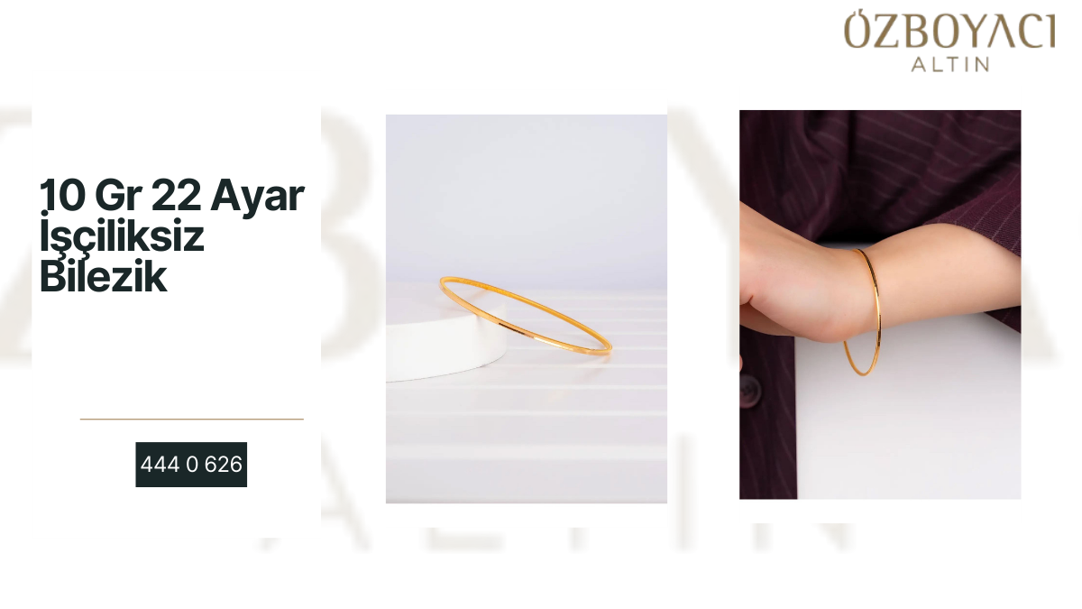 10 Gr 22 Ayar İşçiliksiz Bilezik: İşçiliksiz bir tasarıma sahip olan bu bilezikler, altının doğal parlaklığını ön plana çıkarıyor. Kullanıcılar, günlük hayatta rahatlıkla kullanabilecekleri bu bilezikleri, özel günlerde de şıklıklarını tamamlamak amacıyla tercih ediyor. 10 gramlık ağırlığı, bileziğin hem hafif hem de dayanıklı olmasını sağlıyor. Bu özellik, onu uzun süreli kullanım için ideal hale getiriyor.