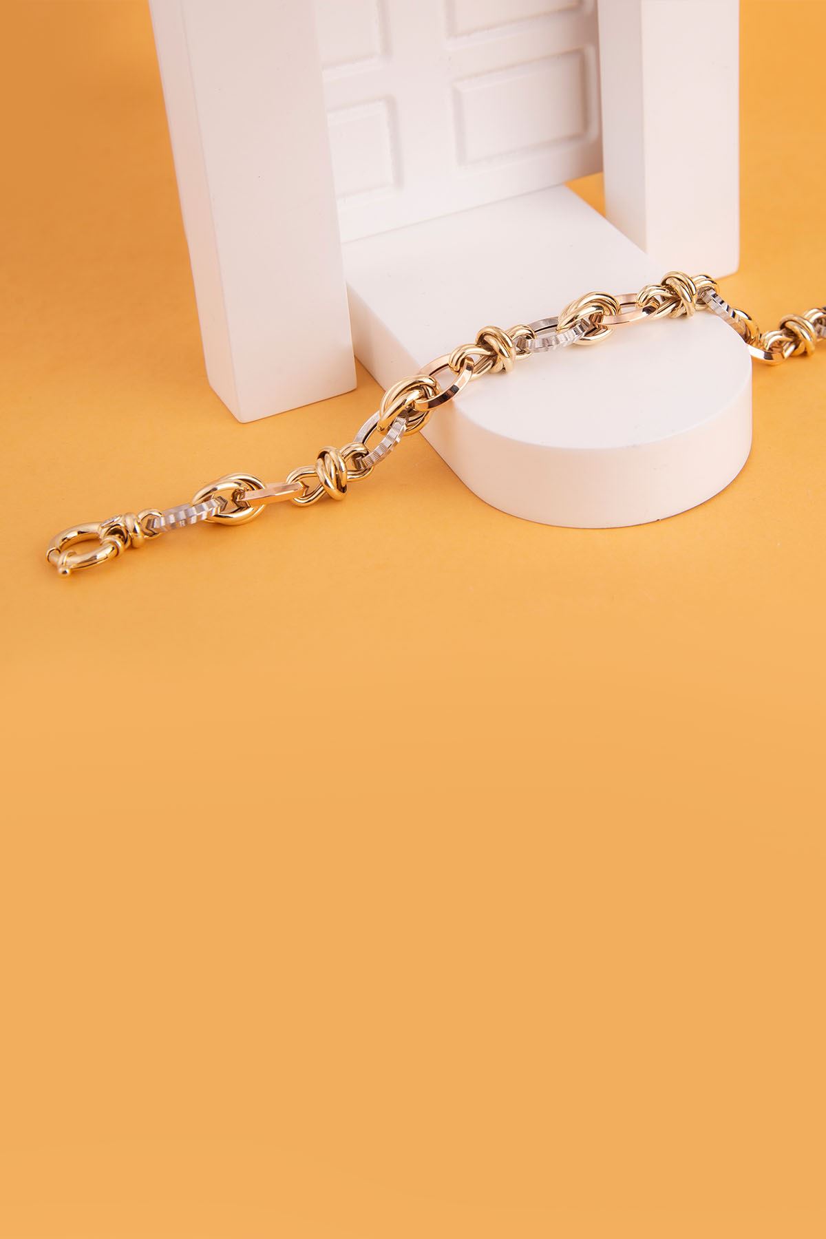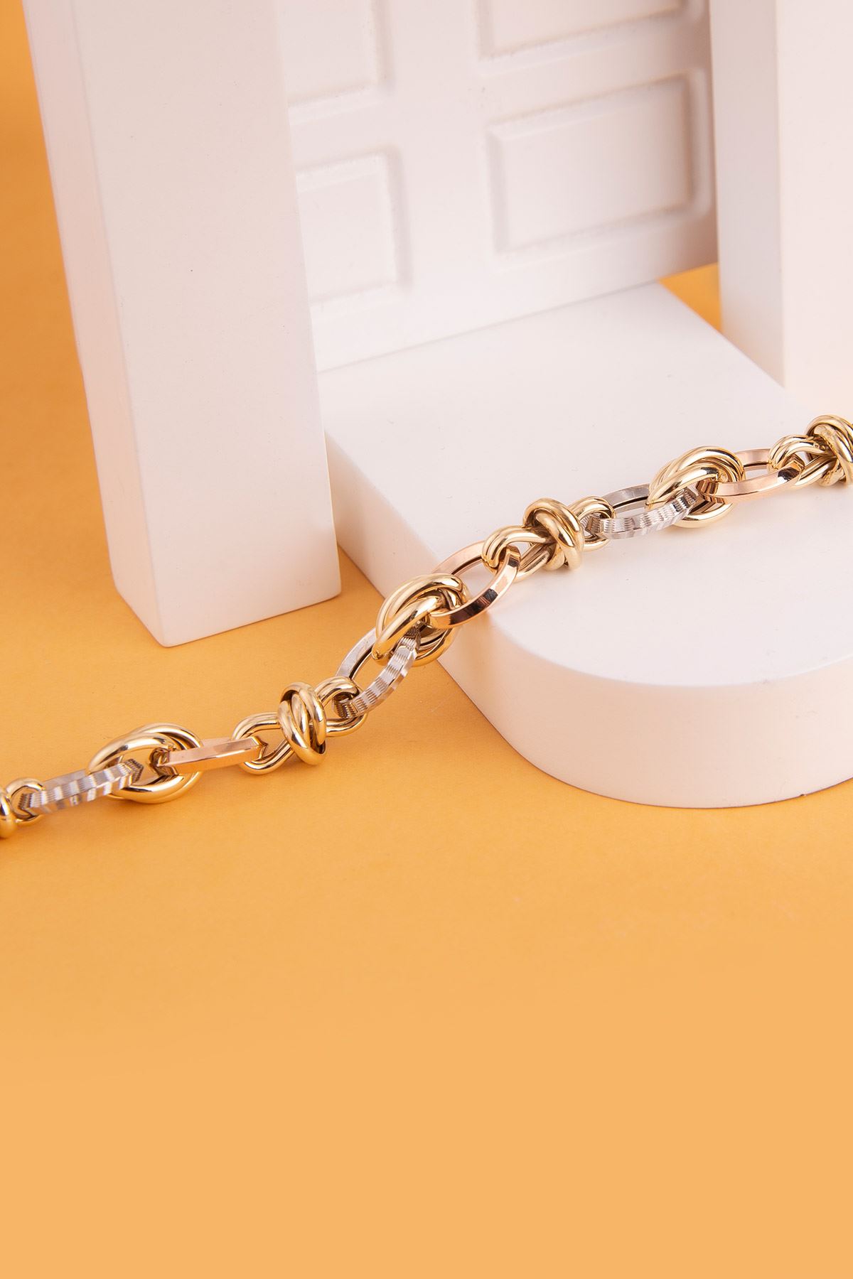 Hallow bilekliğin, birbirlerine sevgi ile tutunmuş tarzları, güçlü görünümleri ile bütünlük kazanıyor. Sarı, bronz ve beyaz altın renkleri ile ışıltılı ve hareketli bir tarzı yakalıyor. Halkalara tutunan düğümler, sıradanlıktan uzak, eğlenceli stilleri ile birbirlerini tamamlıyor.