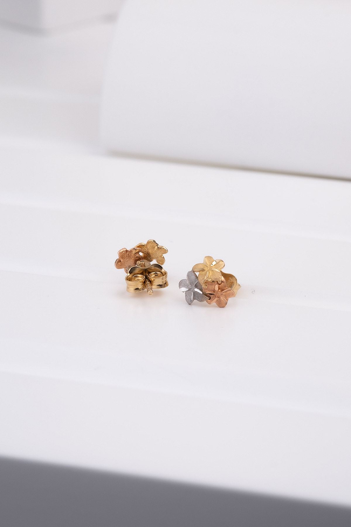 14 Ayar Üç Renkli Altın Vidalı Çiçek Küpe kaliteli işçiliği ile güvenle alışveriş yapabileceğiniz